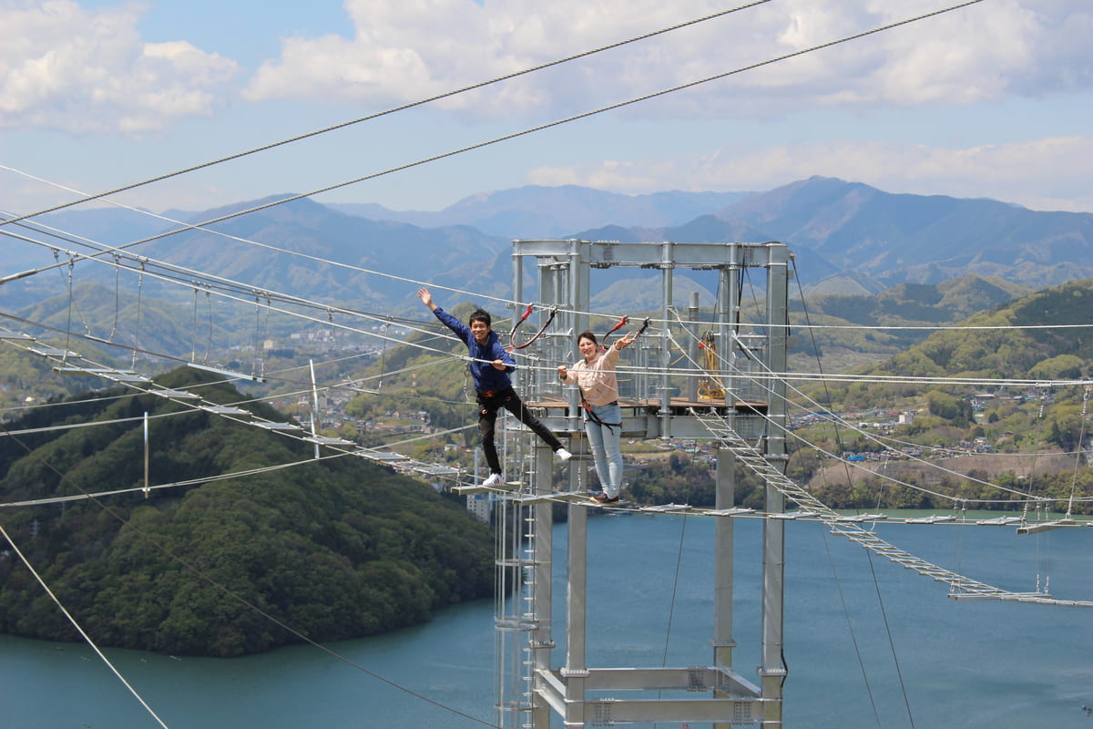 「風天」は、眼下に相模湖を望む標高約370m地点の崖上に設置された最長50mを始めとする8本の長い吊り橋を、命綱を頼りに渡っていくアトラクションで、難易度の異なる4つのコースがあります。