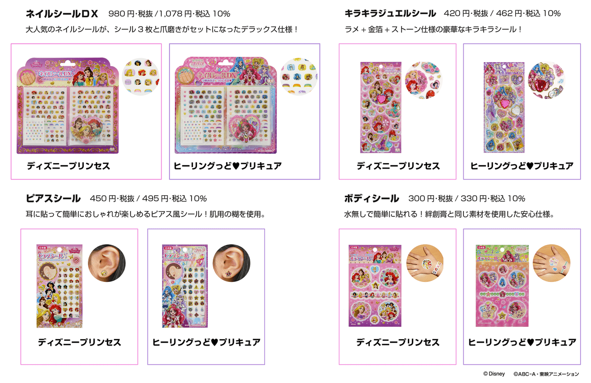シール3枚と爪磨きがセットになったネイルシールDX、ラメ+金箔+ストーン仕様の豪華なキラキラジュエルシール、耳に貼って簡単におしゃれが楽しめるピアスシール、水無しで貼れて絆創膏と同じ素材を使用しているボディシールなどのシール類もそれぞれ登場します!