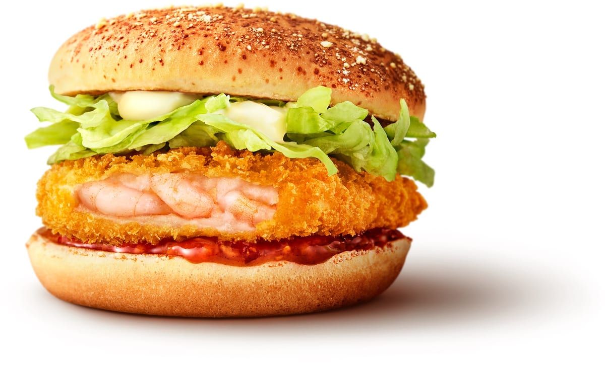 ザクザクとした衣とぷりぷりとしたえびの食感が特長のえびカツに、サクサクとしたフライドガーリックの食感が楽しい特製ソースを合わせ、粉チーズをトッピングした香ばしいバンズではさんだ「ガーリックシュリンプ」