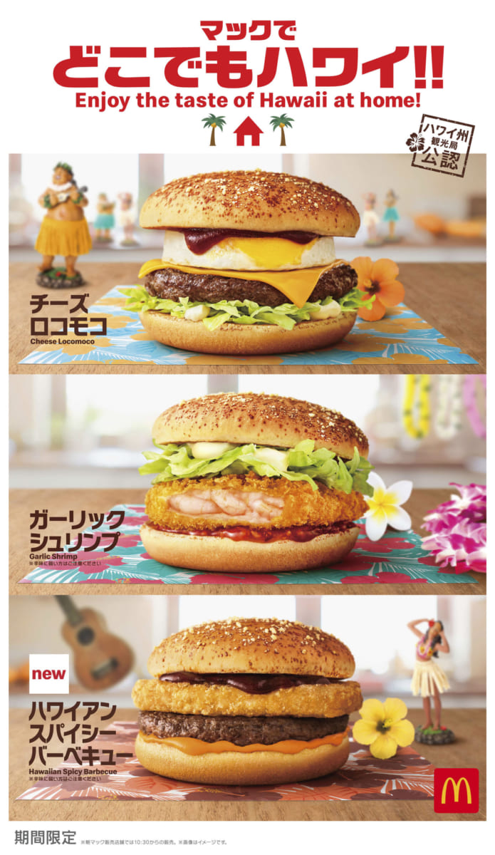 「マックでどこでもハワイ!!」と題し、夏の定番「チーズロコモコ」、2019年大人気だった「ガーリックシュリンプ」に加え、ボリューム満点の新メニュー「ハワイアンスパイシーバーベキュー」などバーガー3商品が登場。