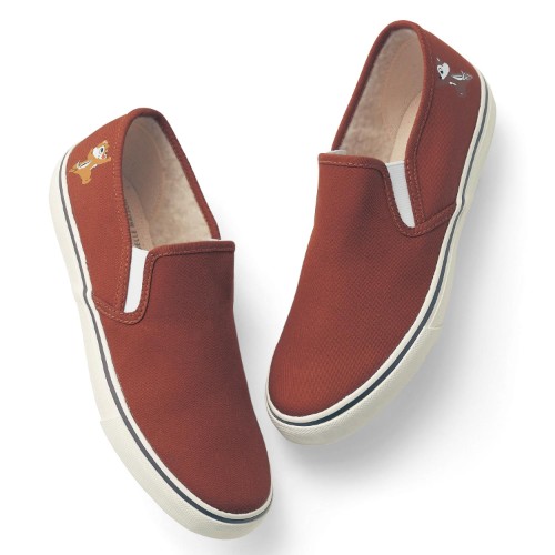 ブラウンを基調とした「チップ&デール」デザインのスリッポンシューズ。