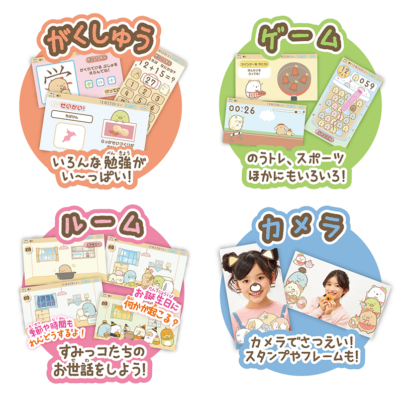 ゲーム、お勉強以外にも「すみっコ」たちのお世話ができる「ルームアプリ」や、カメラも搭載しています。