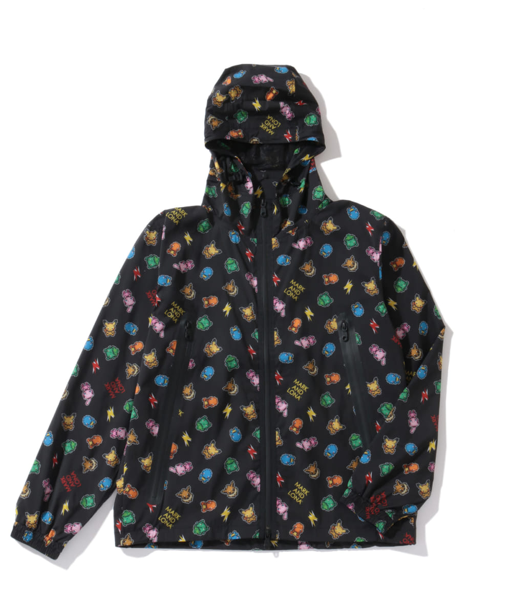 後ろ襟の中心下にALARMネーム、フードと裾にロゴ入りオリジナルコード、ファスナーにオリジナルの引き手をセットした、ポケモンの総柄がクールでポップなジャケットです。