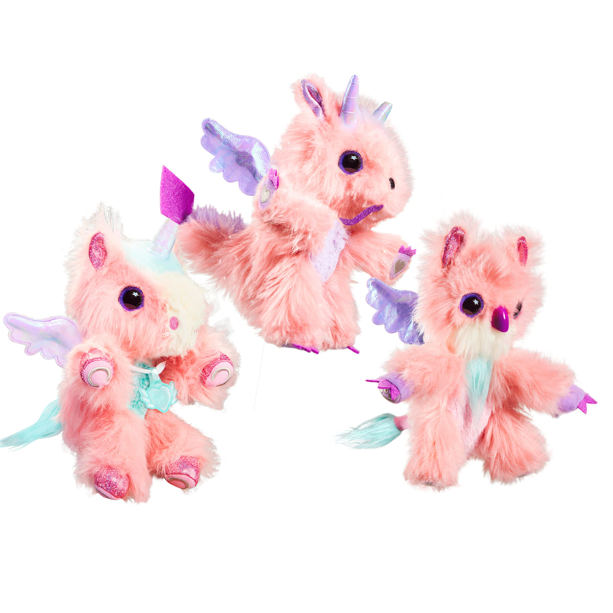 『WHO are YOU?フレーバー』には、「ブルーベリー」「ストロベリー」「バナナ」の3種類の香りがあり、虹色のふわふわで豪華な毛皮をまとった、犬、猫、子ぶたの3種類のいずれかが、ランダムで1つの香りを纏ったぬいぐるみに変化。