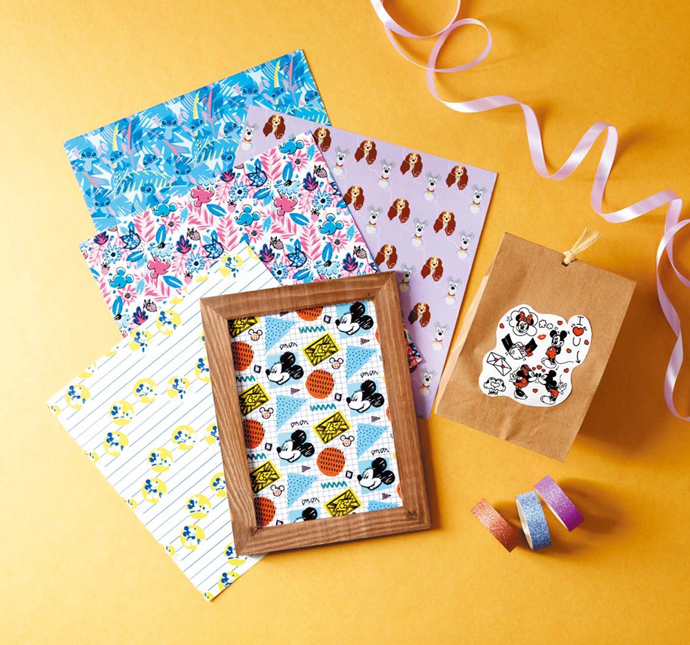 ツルツルとザラザラ、面によって手触りや風合いの異なる紙に、ディズニーの絵柄が印刷されています。