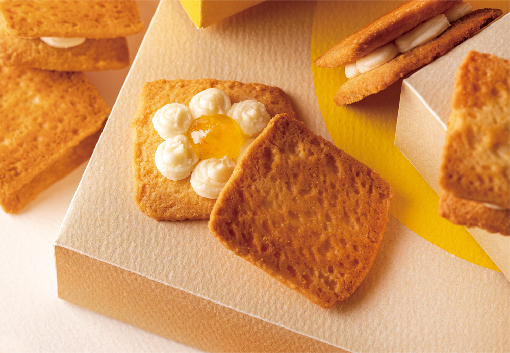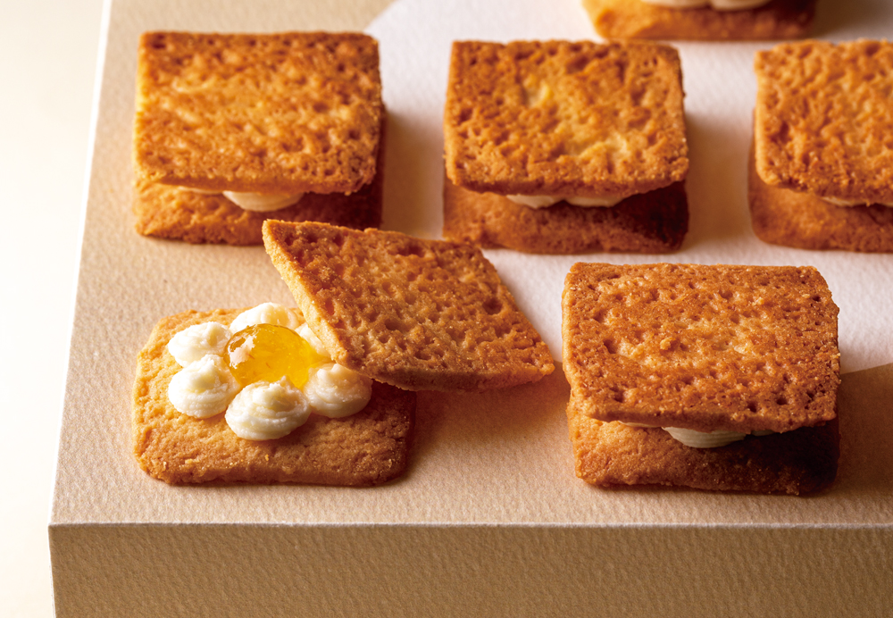 イタリアチーズの王様パルミジャーノ レッジャーノをはじめ、チェダー、ゴーダ、ブルーチーズの厳選4種チーズクリームと、蜂蜜オレンジコンフィチュールがラングドシャクッキーでサンド。