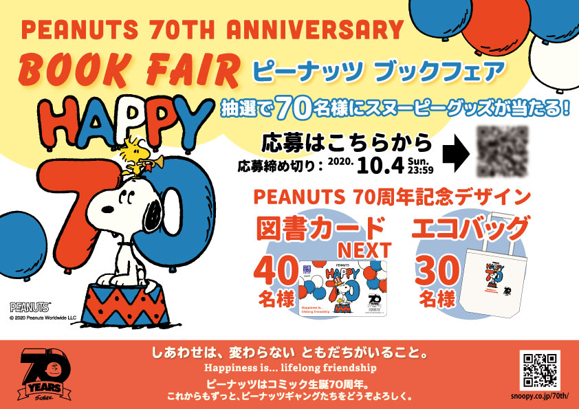 「PEANUTS 70TH ANNIVASARY BOOK FAIR」は2020年8月7日(金)~10月4日(日)まで、全国291の書店で開催です!