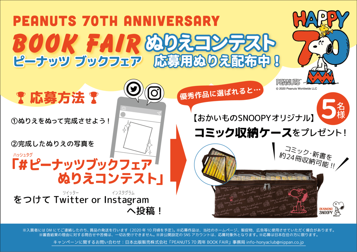 応募方法:「PEANUTS」70周年オリジナル絵柄の塗り絵を完成させてTwitterまたはInstagramに「#ピーナッツブックフェアぬりえコンテスト」を付けて投稿