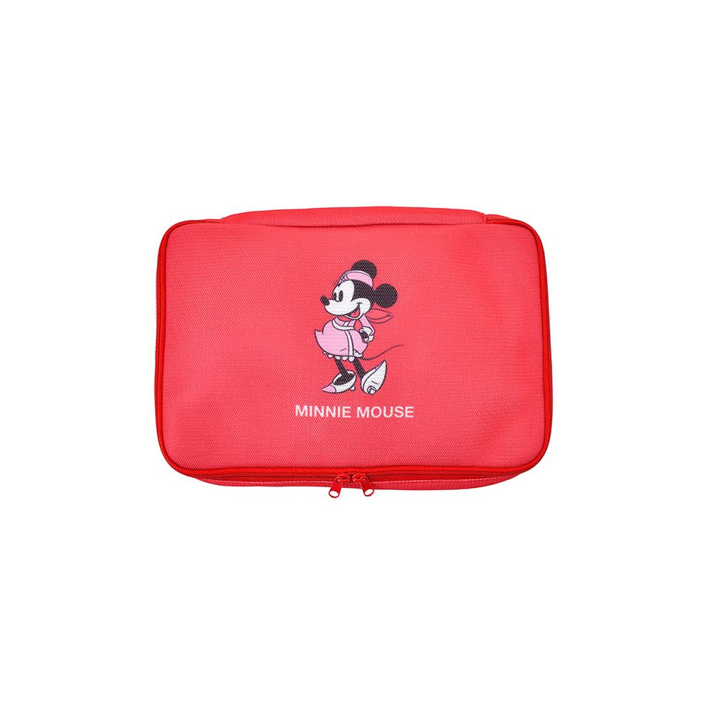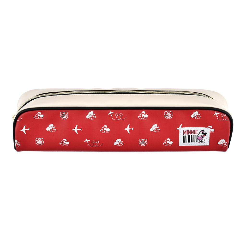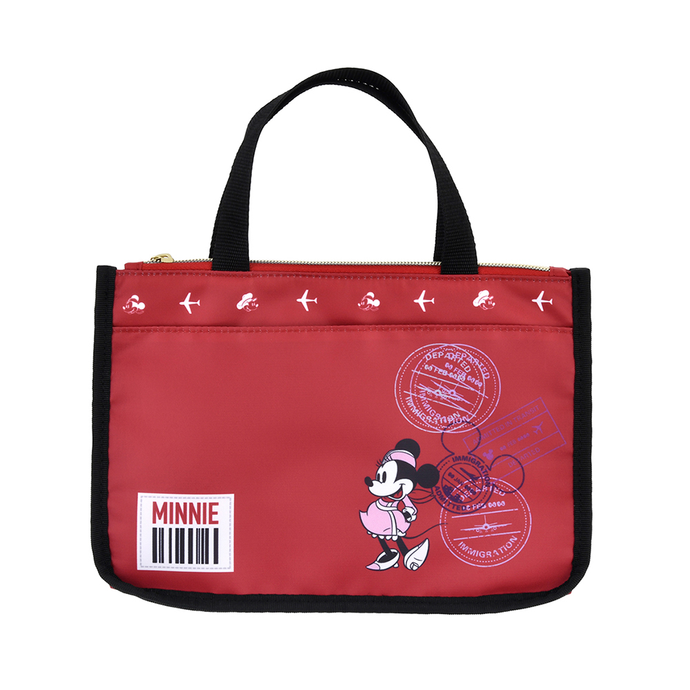 ダークレッドのポーチにキャビンアテンダント姿の「ミニーマウス」がデザインされた、ミディアムサイズの「ポーチ」