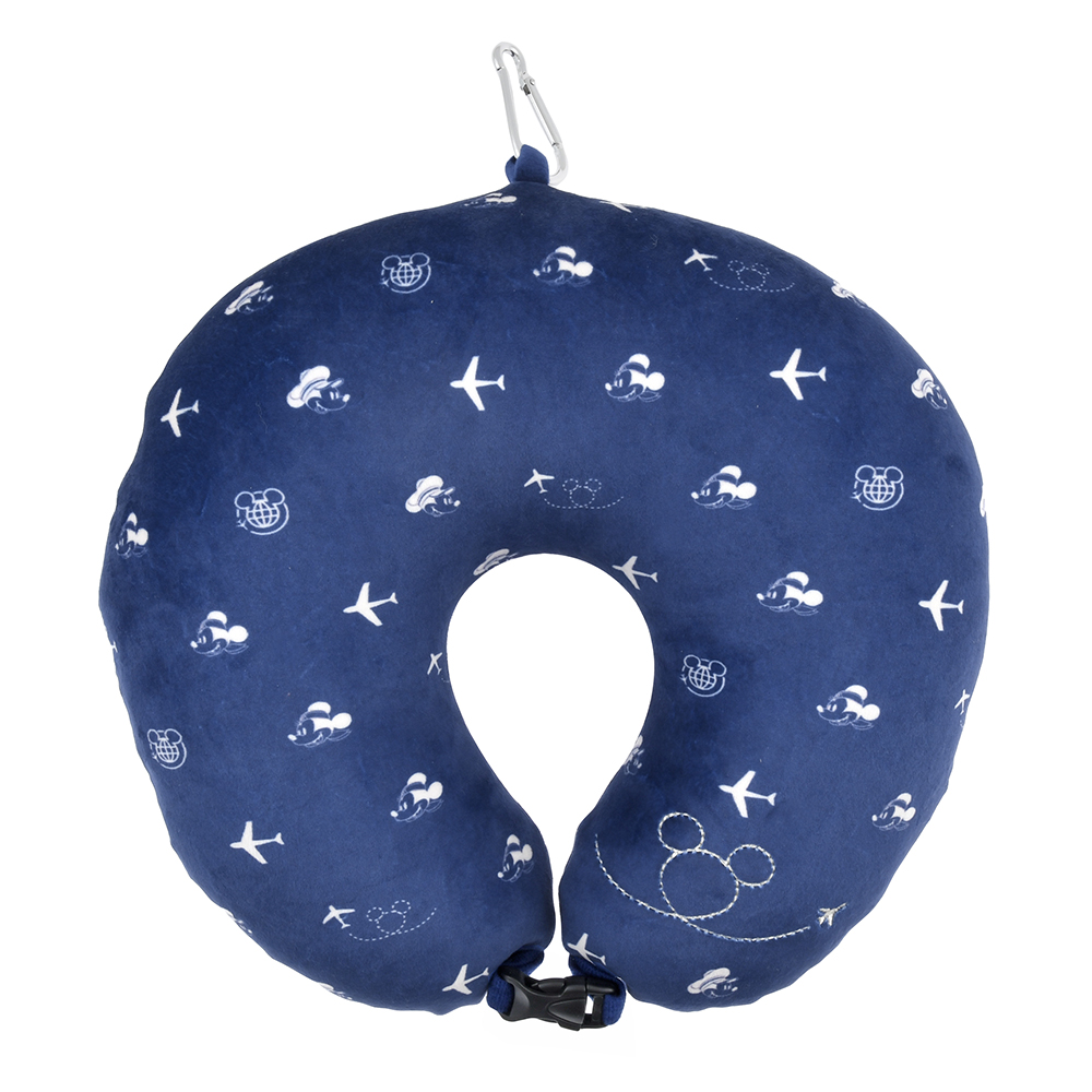 スーツケースのキャリーバーに付けたりと、持ち歩き時に便利なカラビナが付いた「ネックピロー」