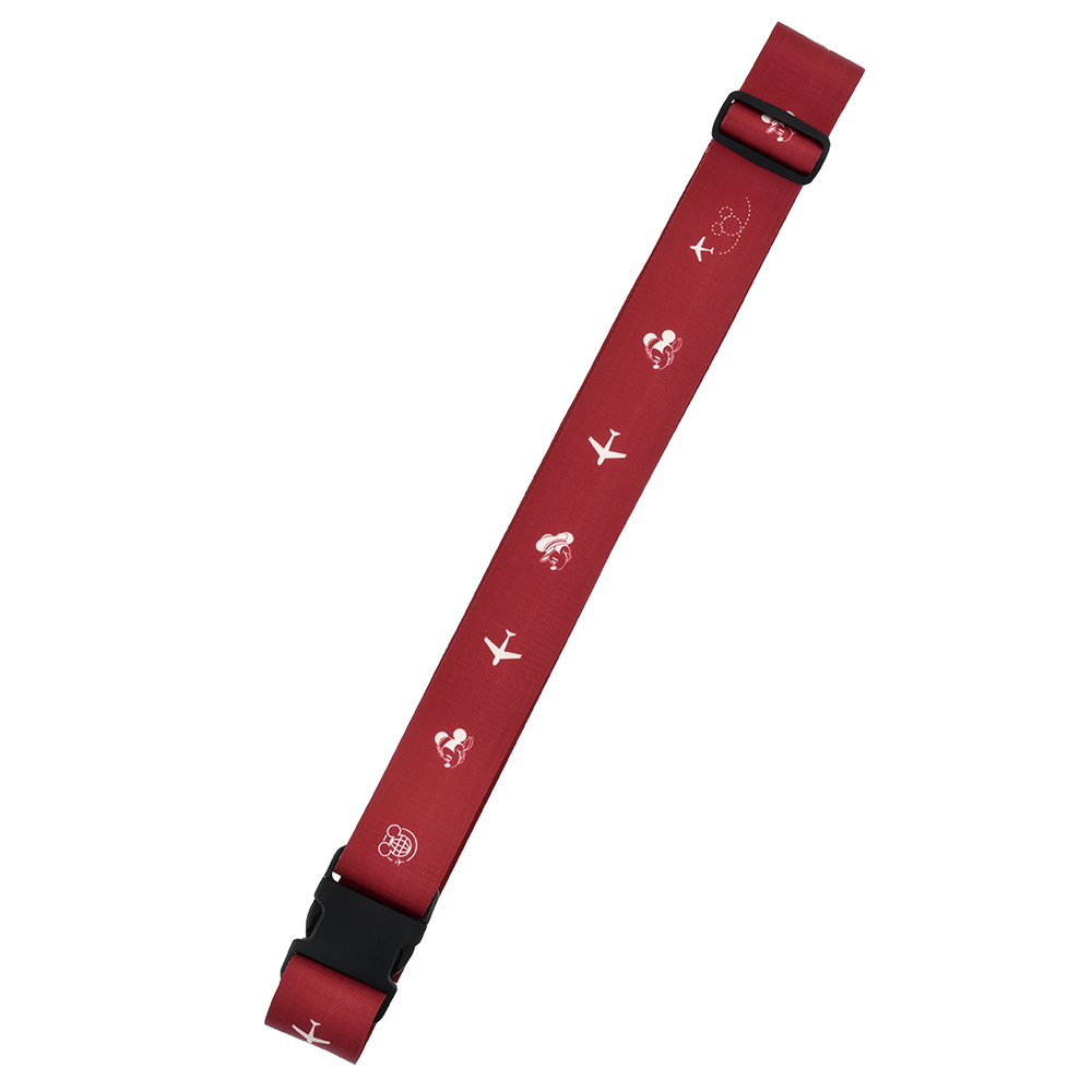ダークレッドのベルトに、パイロットやキャビンアテンダントに扮した2人のフェイスや飛行機など、トラベルにまつわるイラストが並びます☆