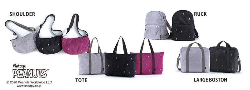 コンパクトに折りたためる、スヌーピーデザインのバックたち。