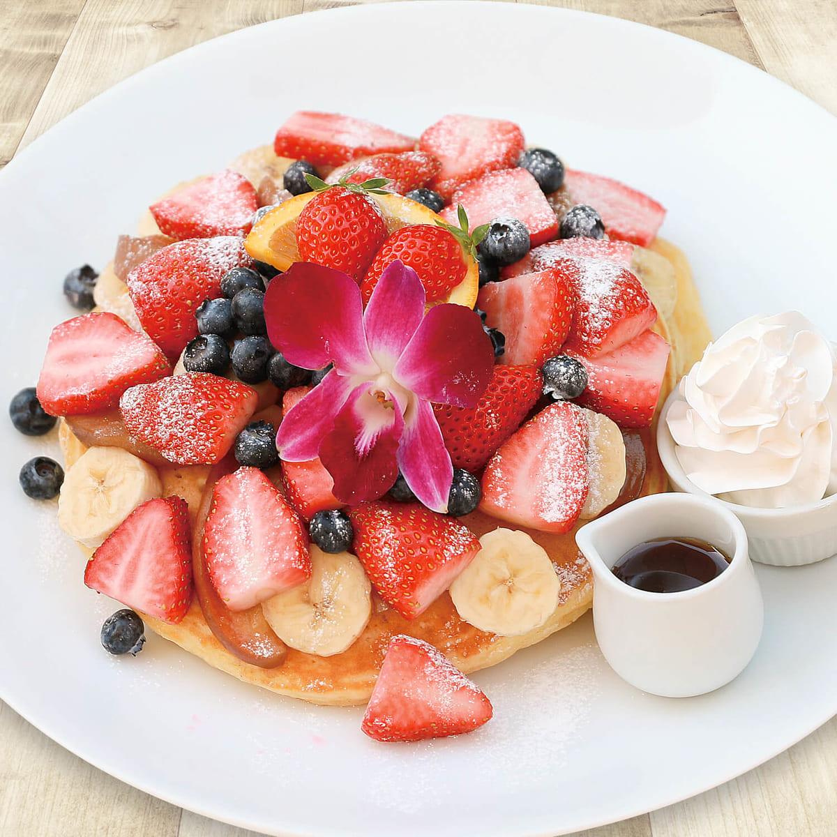 たっぷりのベリーやバナナなど、ジューシーでフレッシュなフルーツをたっぷりのせた「カイラオリジナルパンケーキ」