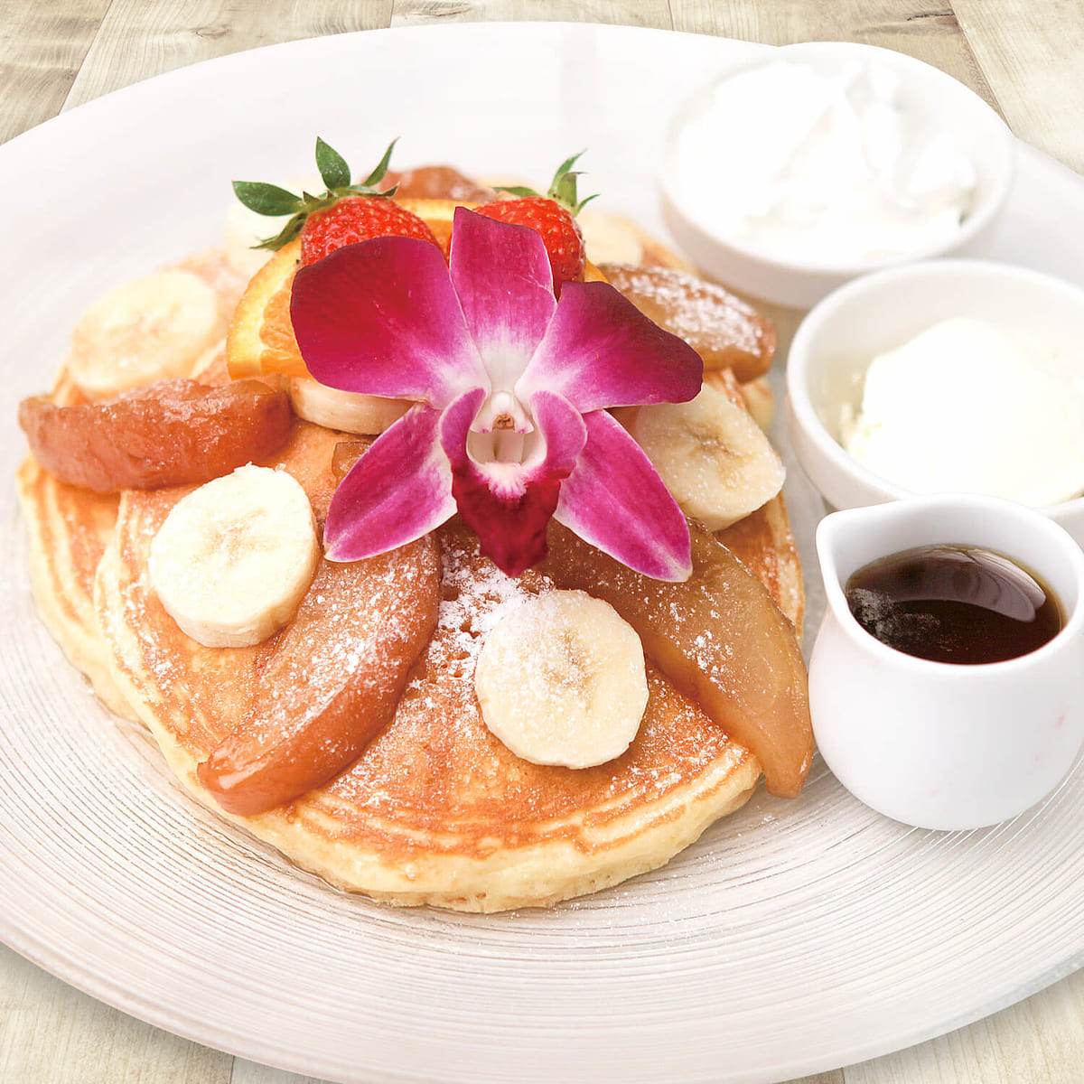 林檎のカラメリゼやバナナをのせた「林檎とクリームチーズパンケーキ」