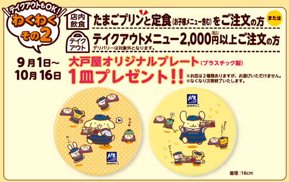 上記期間中、たまごプリンと定食(お子様メニュー含む)を注文の方、または、テイクアウトメニューを2,000円以上注文された方限定で「ポムポムプリン」の大戸屋オリジナルプレートをプレゼント。