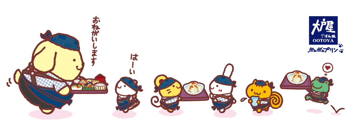 大戸屋のコスチュームを着た「ポムポムプリン」や仲間たちがお料理を運ぶ姿が愛らしく描かれています☆