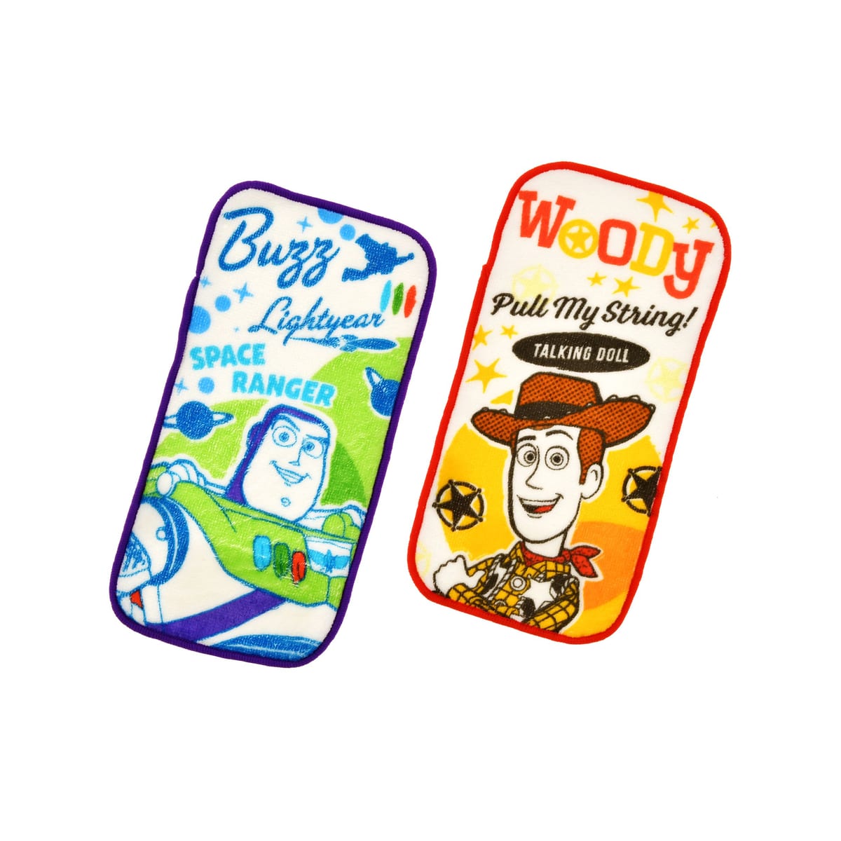 『トイ・ストーリー』の「ウッディ」と「バズ・ライトイヤー」デザインのポケットタオル。