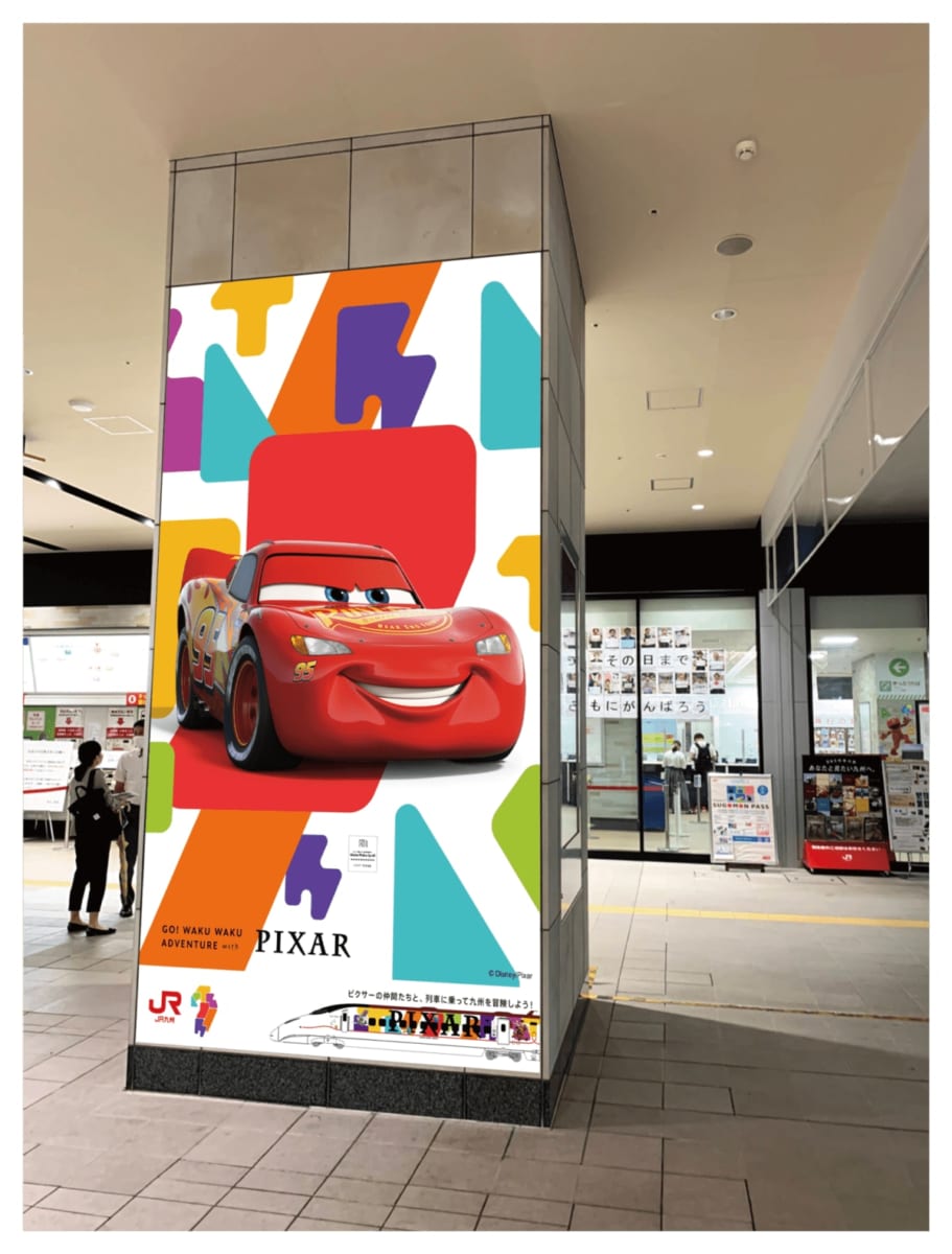 JR 九州の主な駅には、キービジュアルとピクサーのキャラクターたちが デザインされたポスターが登場します。