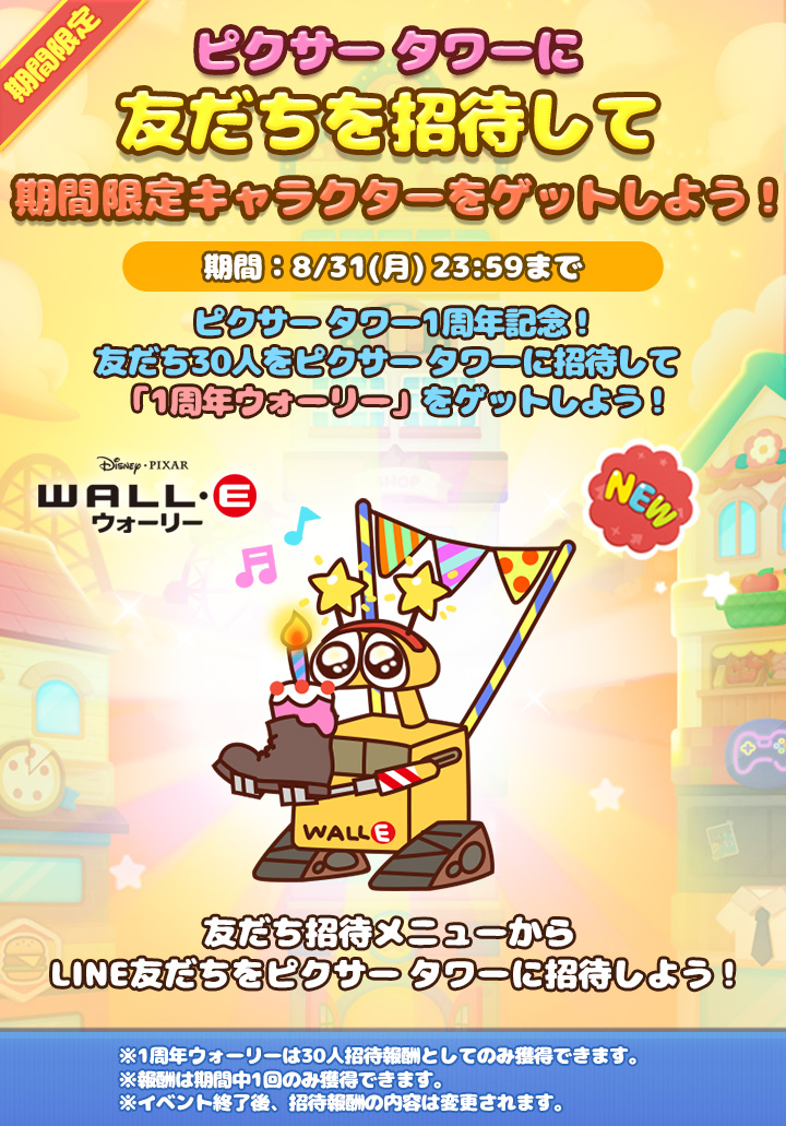 対象期間中に30名の友だちを招待すると、「1周年ウォーリー」が無料でもらえる友だち招待イベントを開催中!