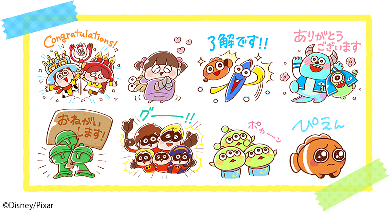 ピクサーの人気キャラクターが勢ぞろいしている、ここでしか入手できないスタンプです。