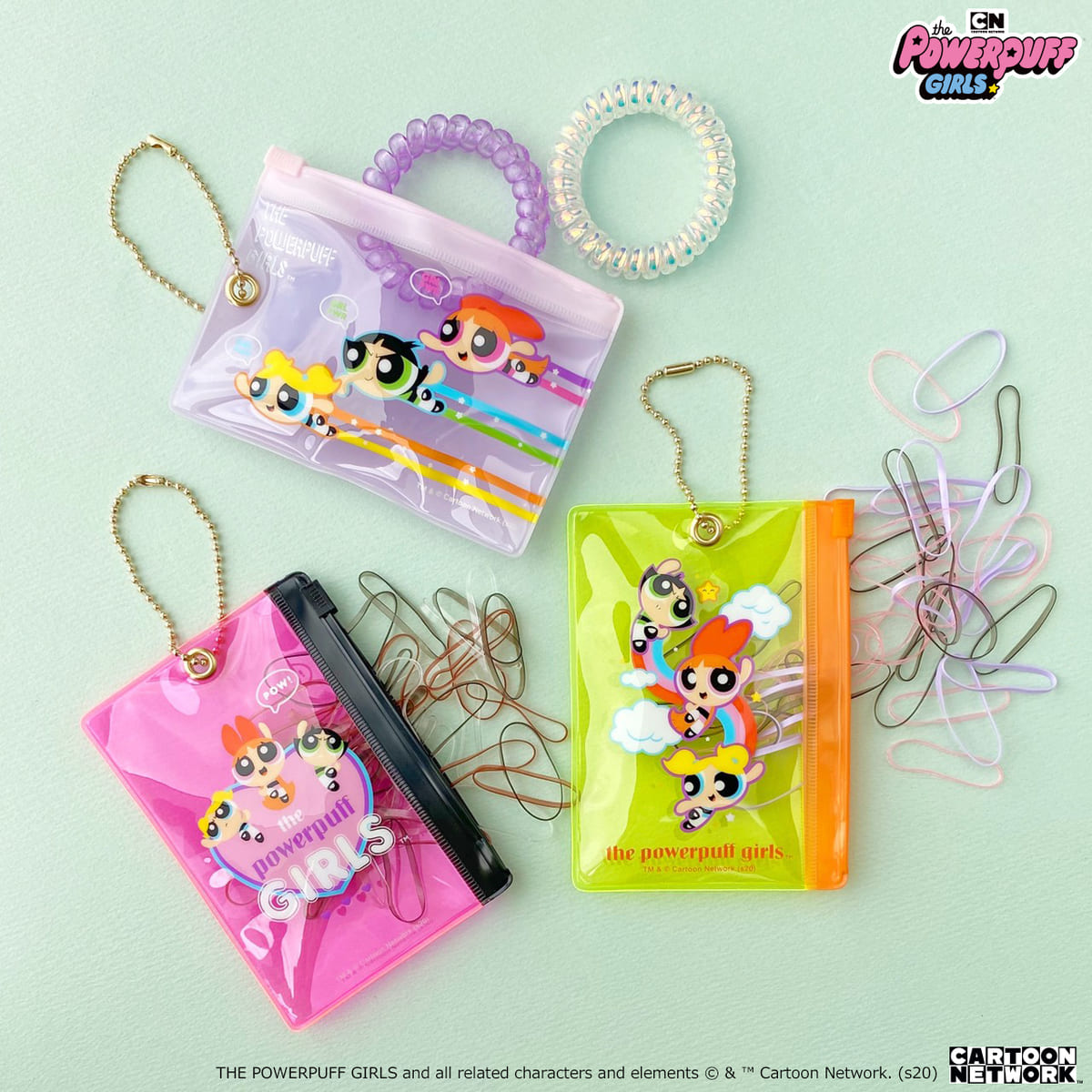 また、『パワーパフ ガールズ』のアートがプリントされたポーチに入ったヘアゴム3種も同時発売。