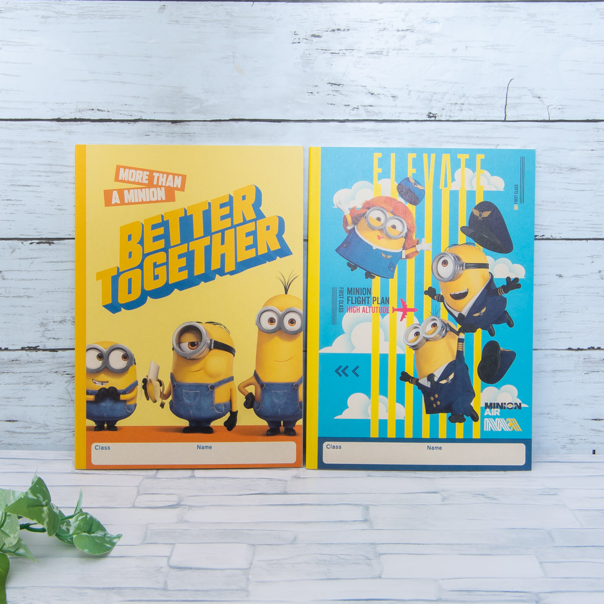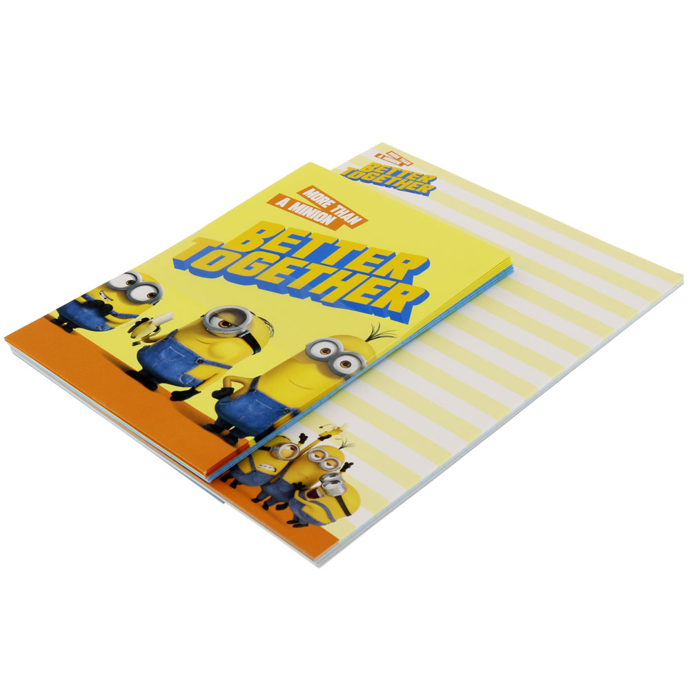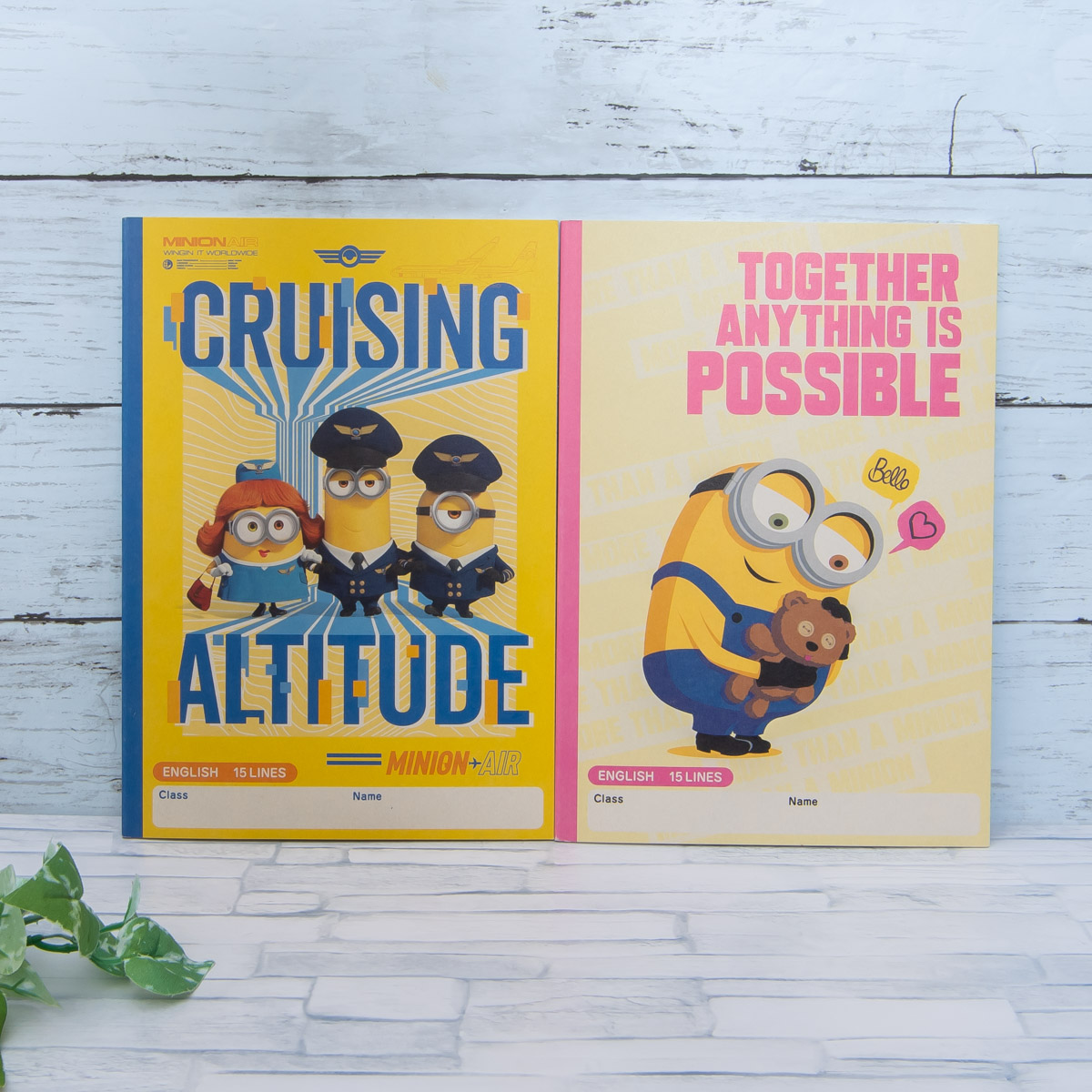 コミカルな制服姿でミニオンたちが描かれた表紙と、「ティム」を抱きしめる「ボブ」がデザインされた表紙で展開される「英習帳」英習帳 中