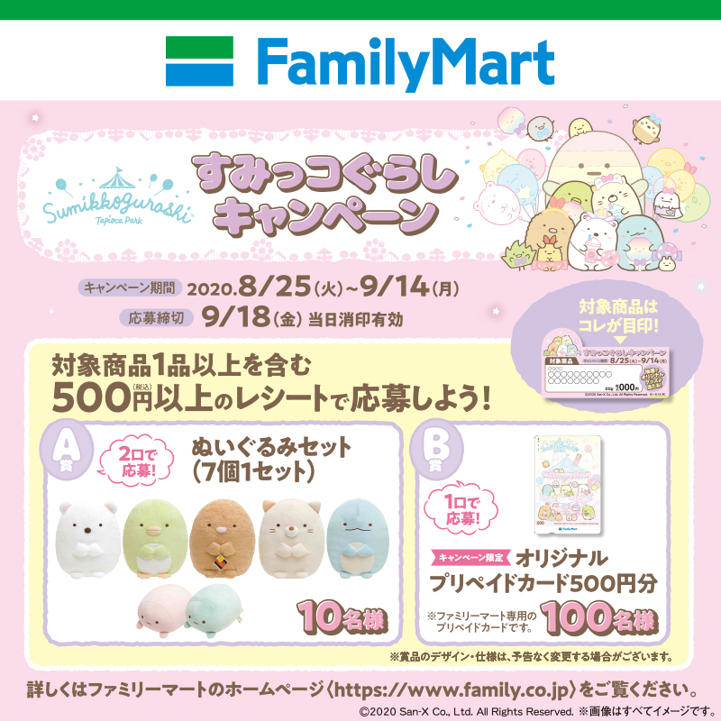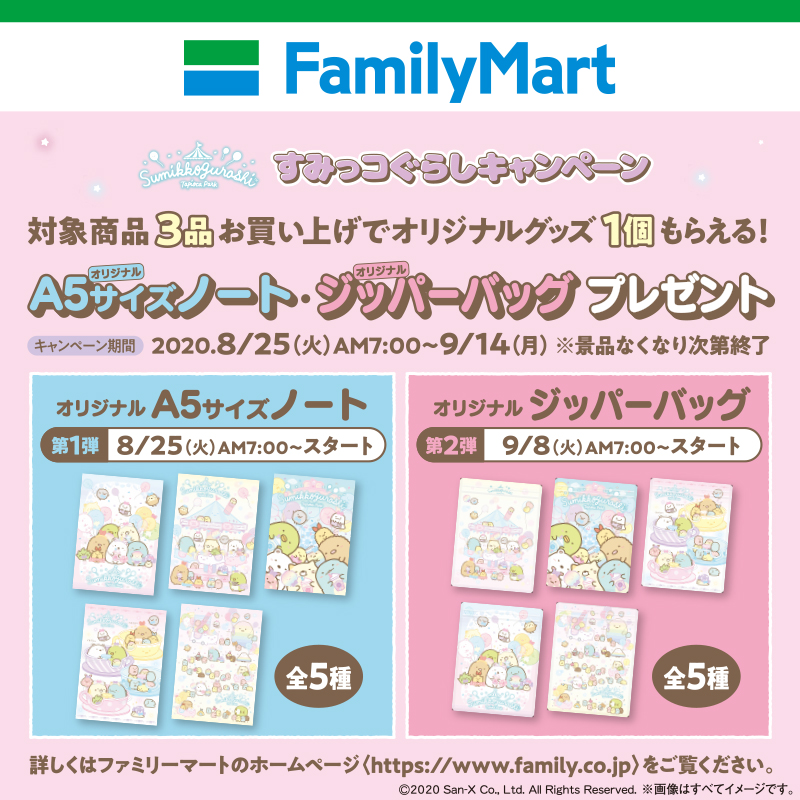 ファミリーマートの「すみっコぐらしキャンペーンは」2020年8月25日(火)から9月14日(月)まで開催です。