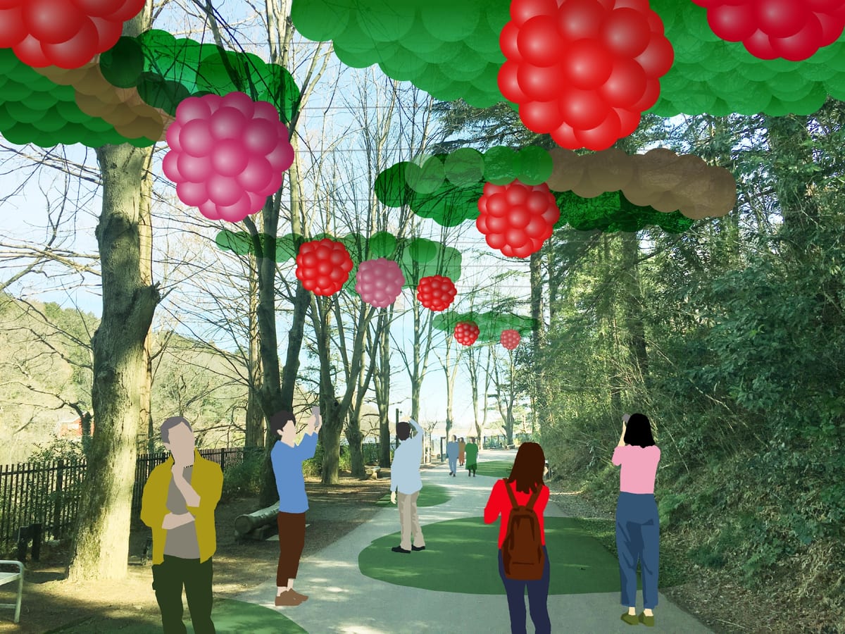 上空につるされたバルーンで秋の実りが表現された「ハーベストゲート」「ベリーの道」「りんごの森」の3つのエリアは、フォトスポットとしても楽しめるエリア。