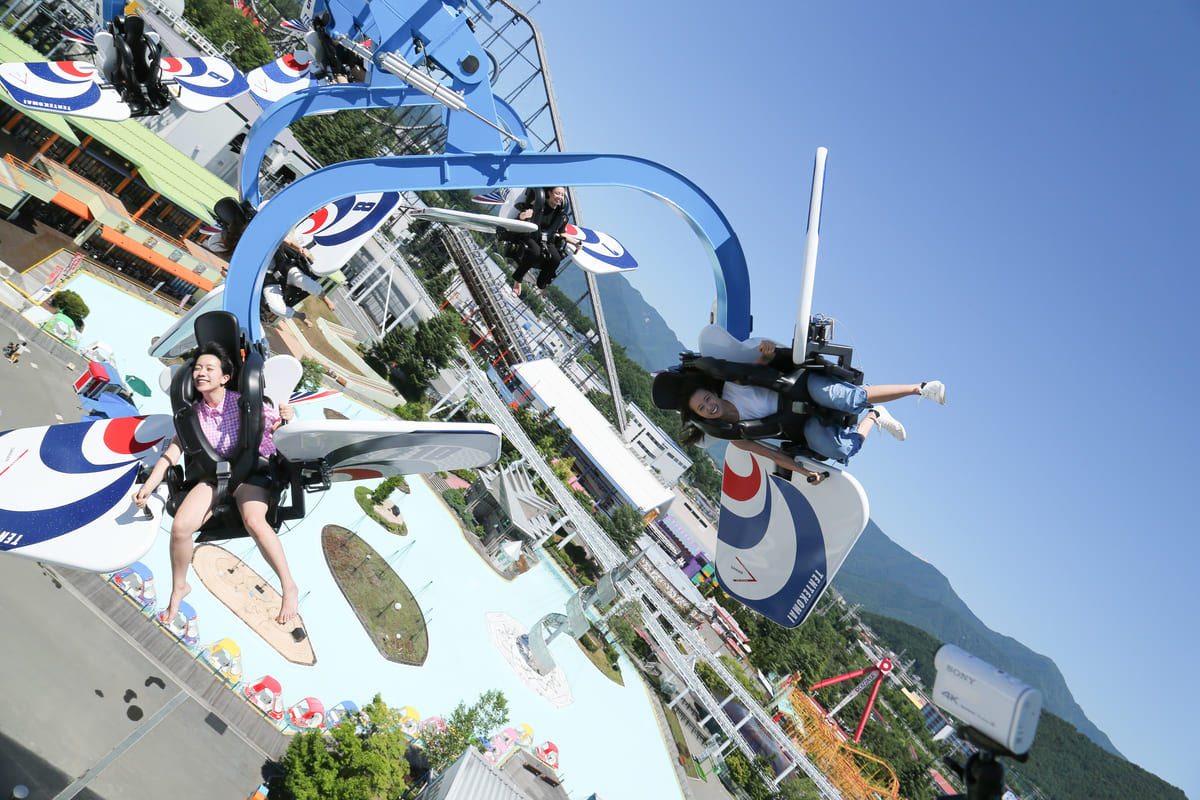 「テンテコマイ」は、地上32mの高さで自ら翼を操縦できる、回転系絶叫アトラクション。