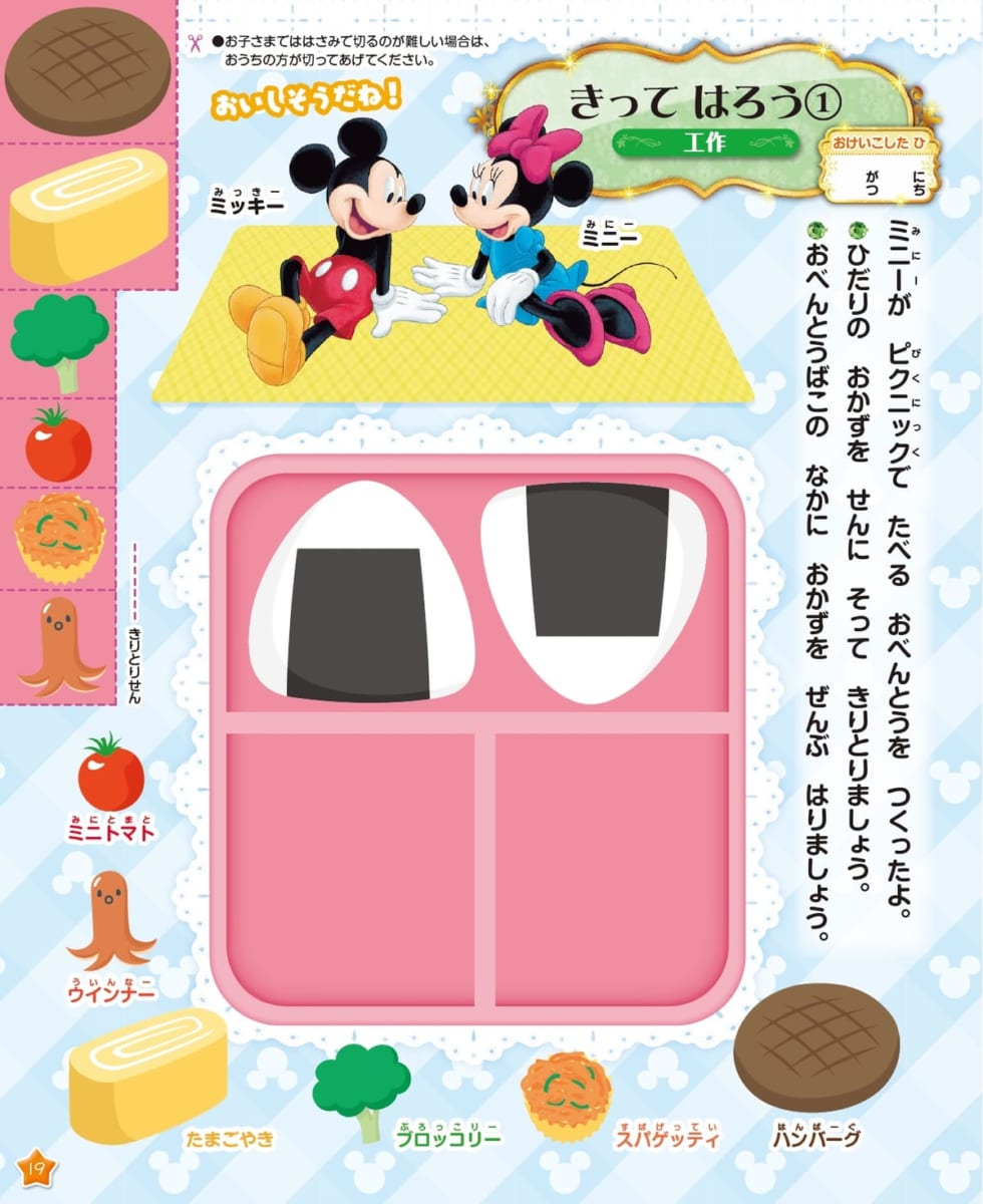 切ったり、貼ったりして「ミッキー」と「ミニー」と一緒に工作をするページ、