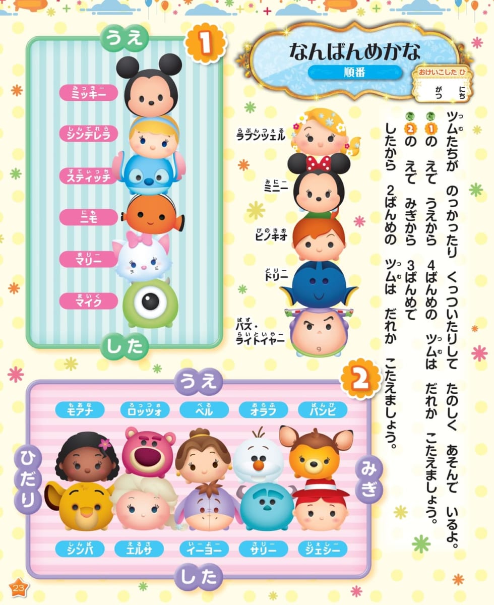「ディズニーツムツム」たちと順番を学べるページなど、たくさんのディズニーの人気キャラクターたちが登場します。