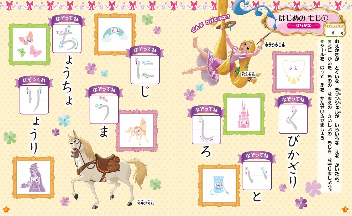 ほかにも、『塔の上のラプンツェル』のディズニープリンセス「ラプンツェル」と一緒にひらがなが学べるページに、