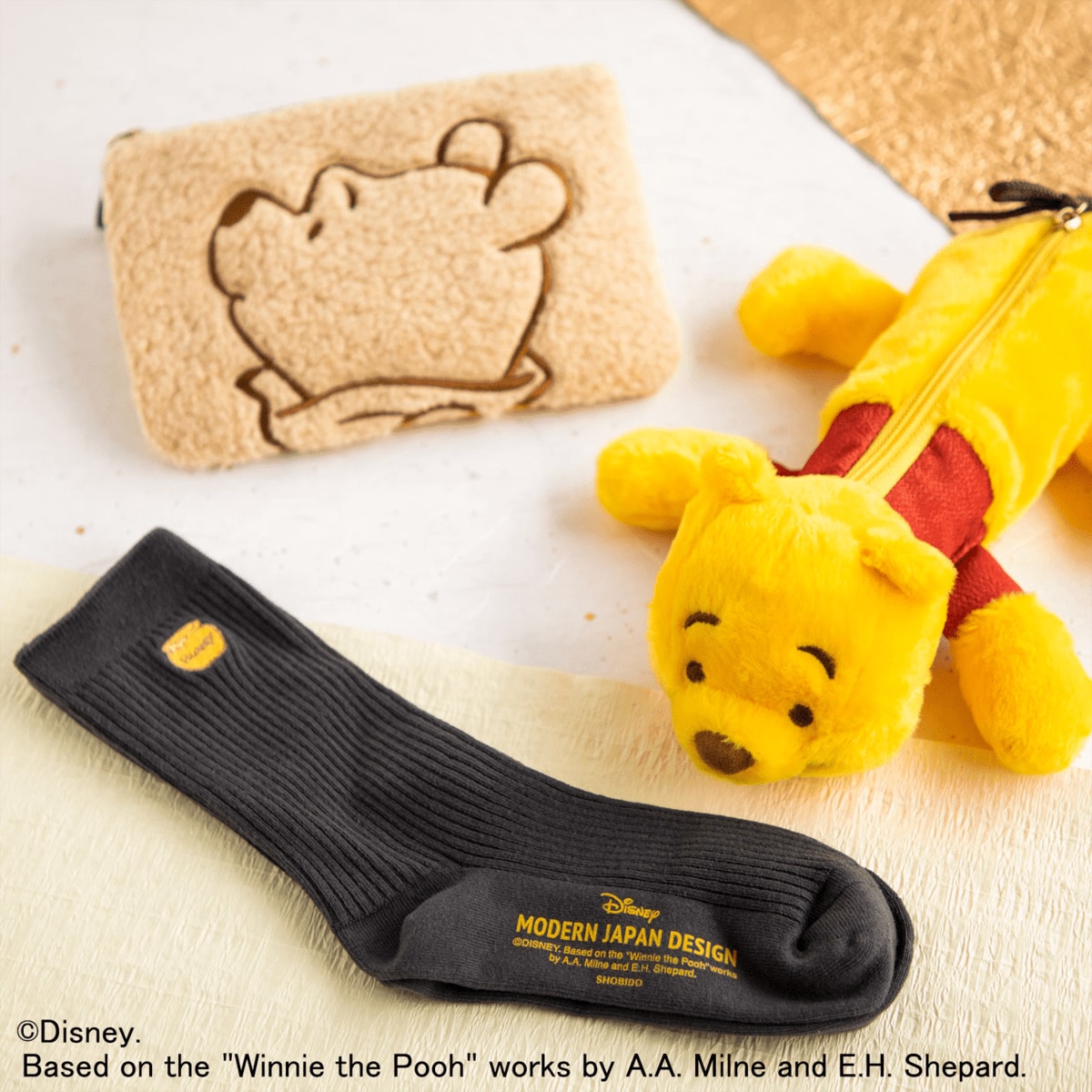 ふわふわの手触りが「プーさん」デザインにぴったりな、ボアポーチとぬいぐるみ&靴下セット。