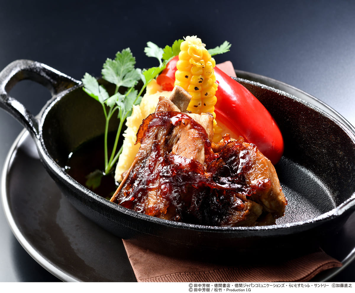 コーンやパプリカ、サラダと共にいただく「ビッテンフェルトの猪突猛進スペアリブ」
