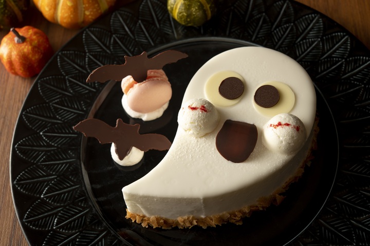 かわいいお化けのデコレーションに、コウモリのチョコをあしらったマカロンを添えた、ハロウィーン限定ケーキです。