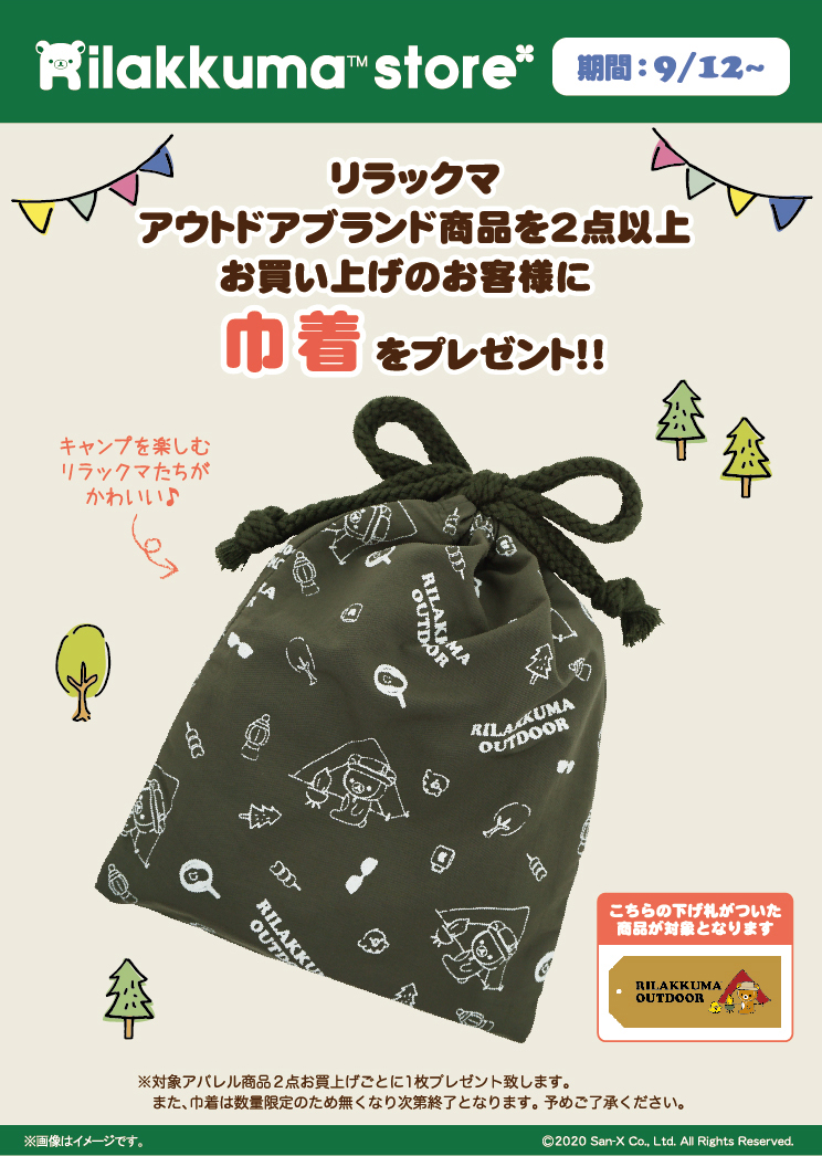 リラックマストアで、アウトドアブランド商品を2点以上買うと限定ノベルティがもらえます☆