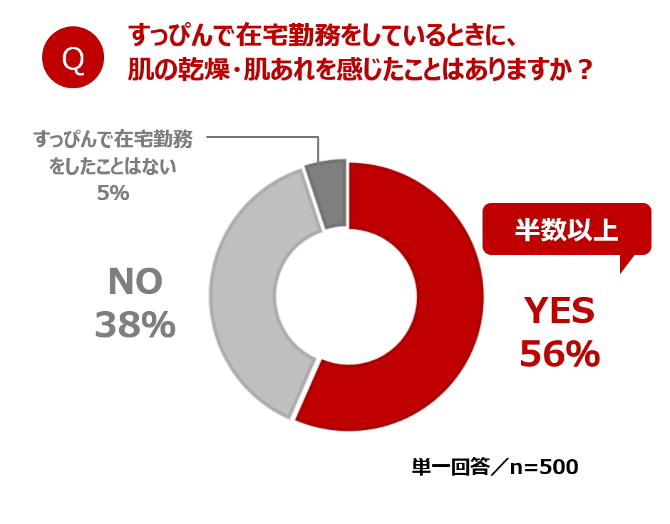 その結果、約6割(56%)の女性が「すっぴんで在宅勤務をしているときに、肌の乾燥・肌あれを感じたことがある」と回答されました。