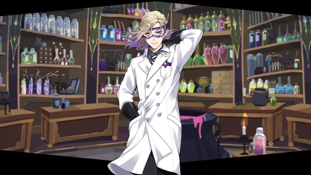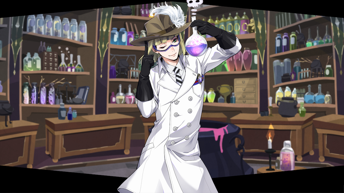 丸底フラスコを手に満足げな表情を浮かべた「SR ルーク[実験着]」、