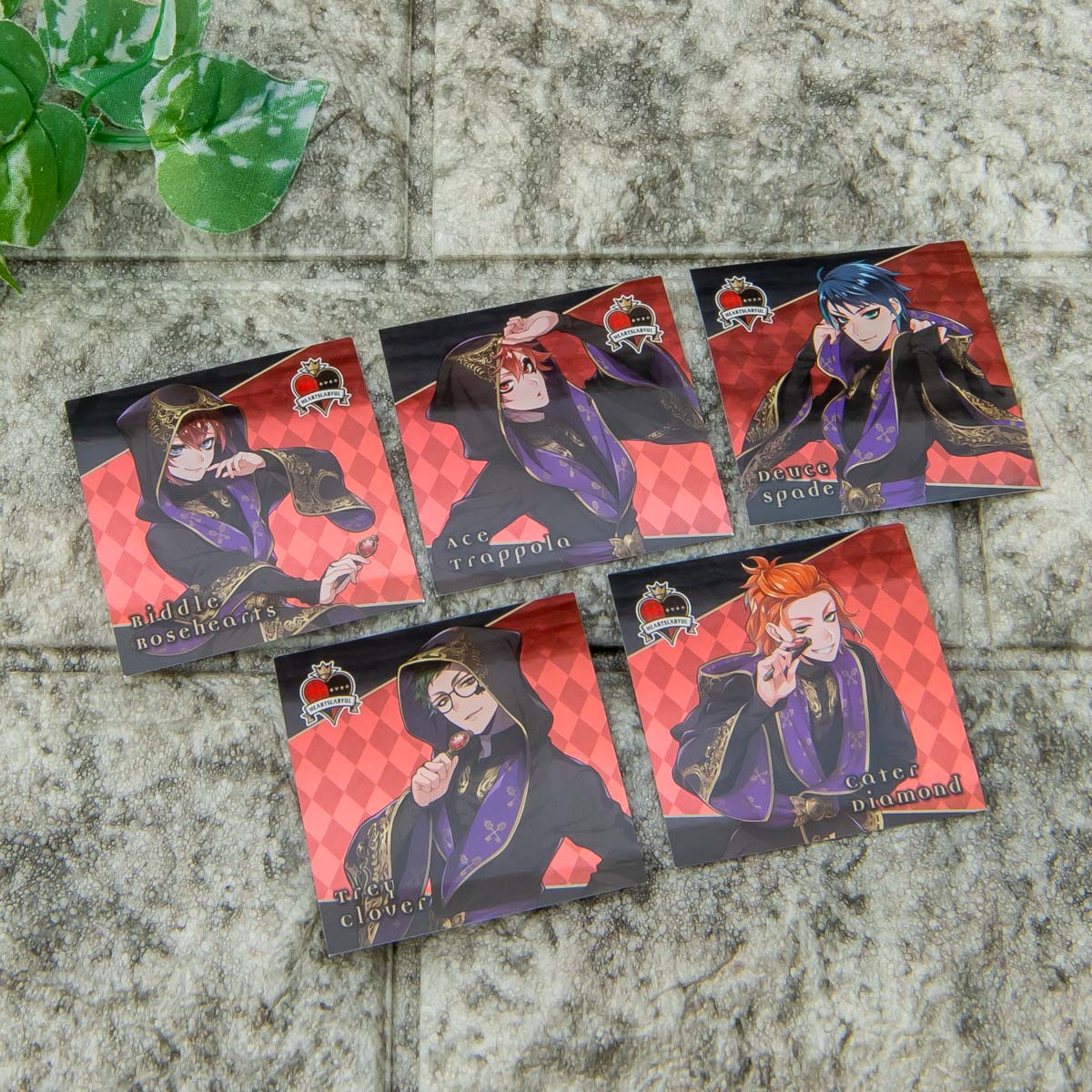 寮長の「リドル・ローズハート」のほか、「エース・トラッポラ」、「デュース・スペード」、「トレイ・クローバー」、「ケイト・ダイヤモンド」の5枚がラインナップされています。