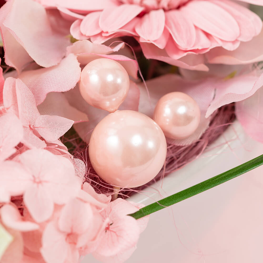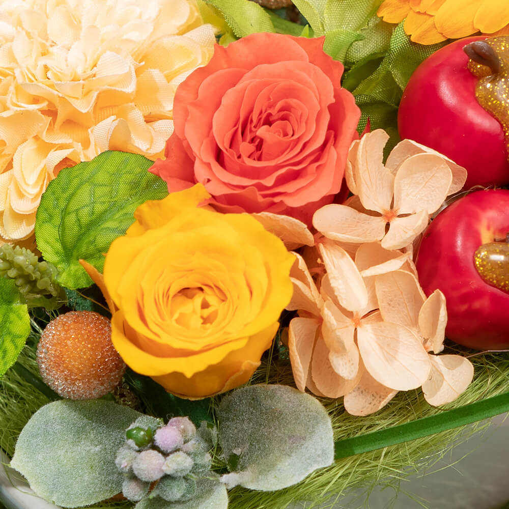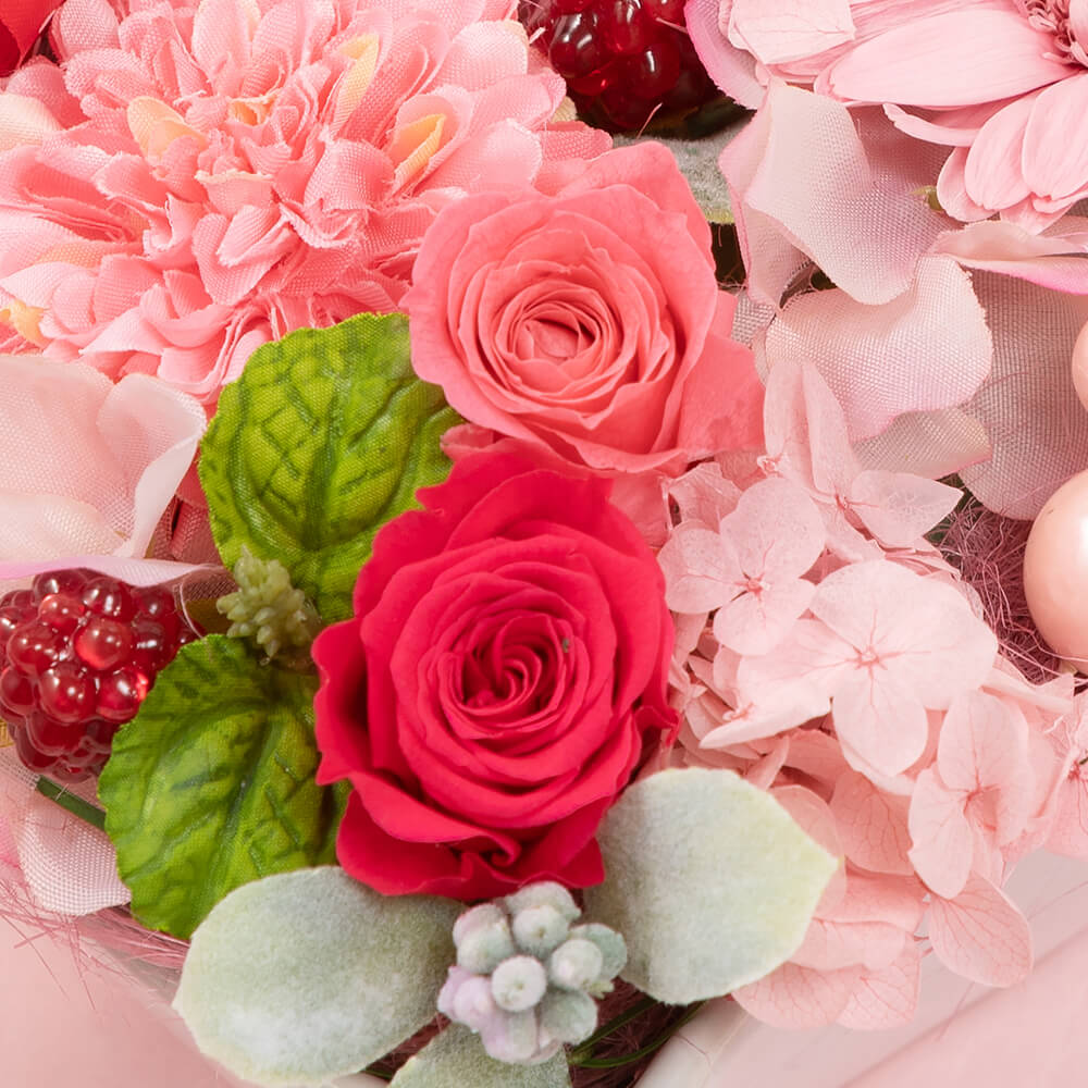 生花のように瑞々しく、半永久的に枯れないプリザーブドフラワーのガーベラ、ミニバラ、アジサイが、陽だまりのように心を温かくしてくれます。