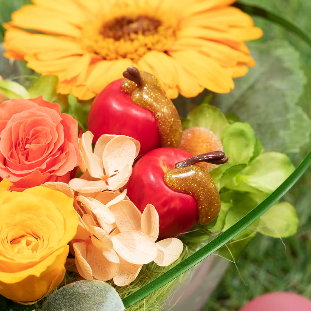 アートフラワー:姫りんご、マム、アジサイ、アイビー、ミント、グリーン
