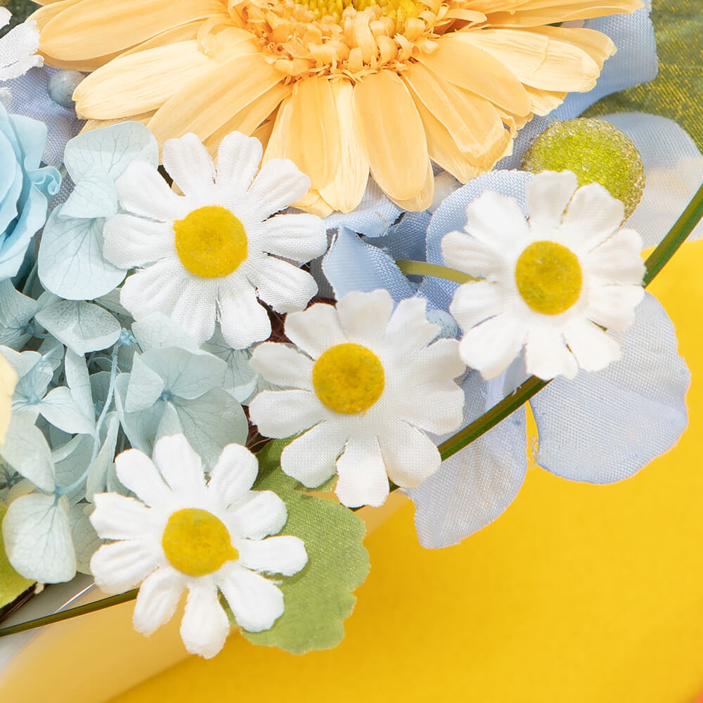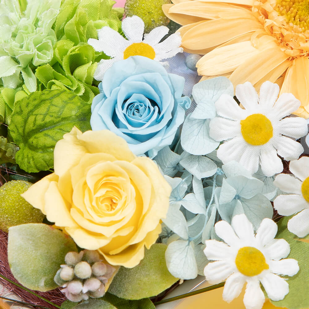 プリザーブドフラワーのガーベラ、ミニバラ、アジサイを中心に、爽やかなイエロー系・ブルー系の花々がたくさん入っています。