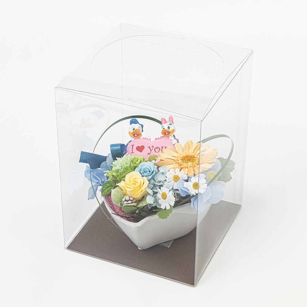 ディズニー プリザーブドフラワー「メッセージ ウィズ ハート/ドナルド&デイジー」は、「ドナルドダック」&「デイジーダック」をイメージした元気いっぱいなアレンジメントです。