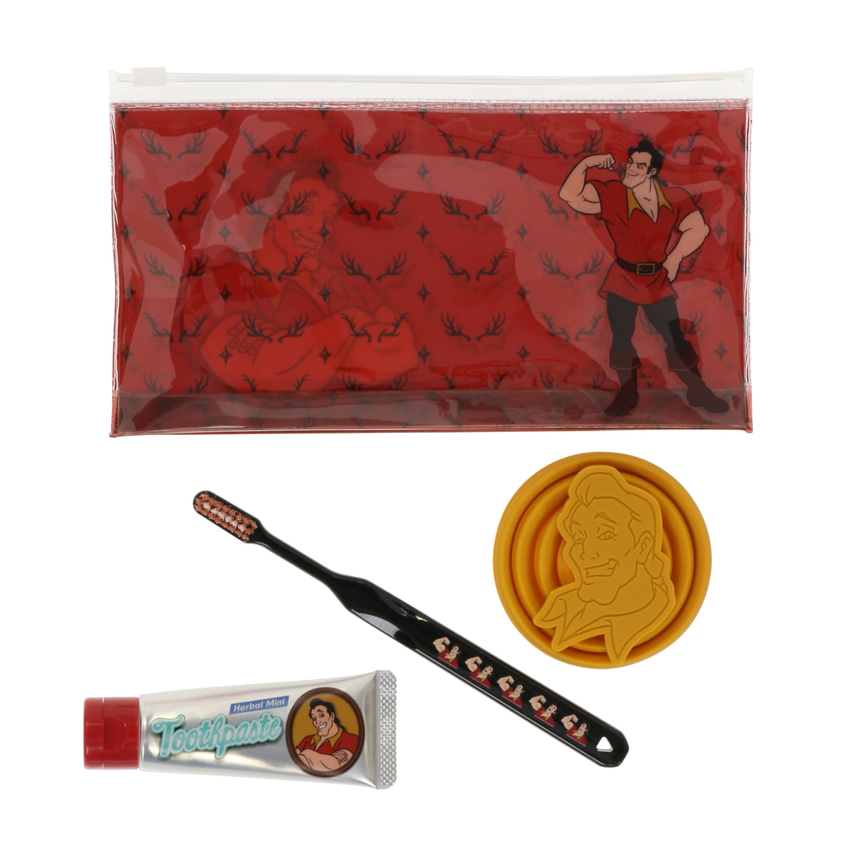 ポーチの中には、歯磨き粉、歯ブラシ、コップが履いていて、いずれも「ガストン」柄!