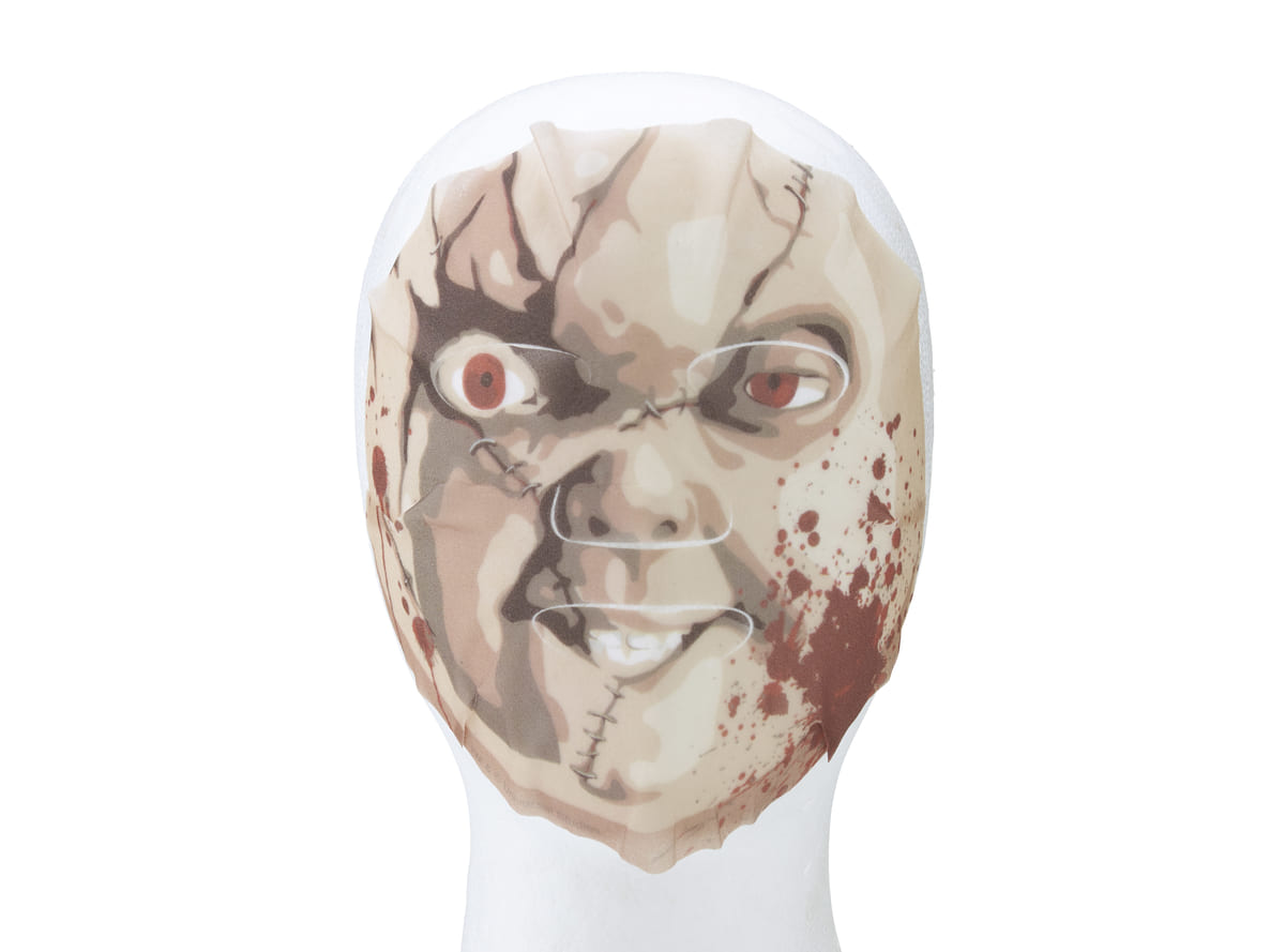 返り血を浴びた「チャッキー」のお顔が大胆にプリントされたフェイスパック。