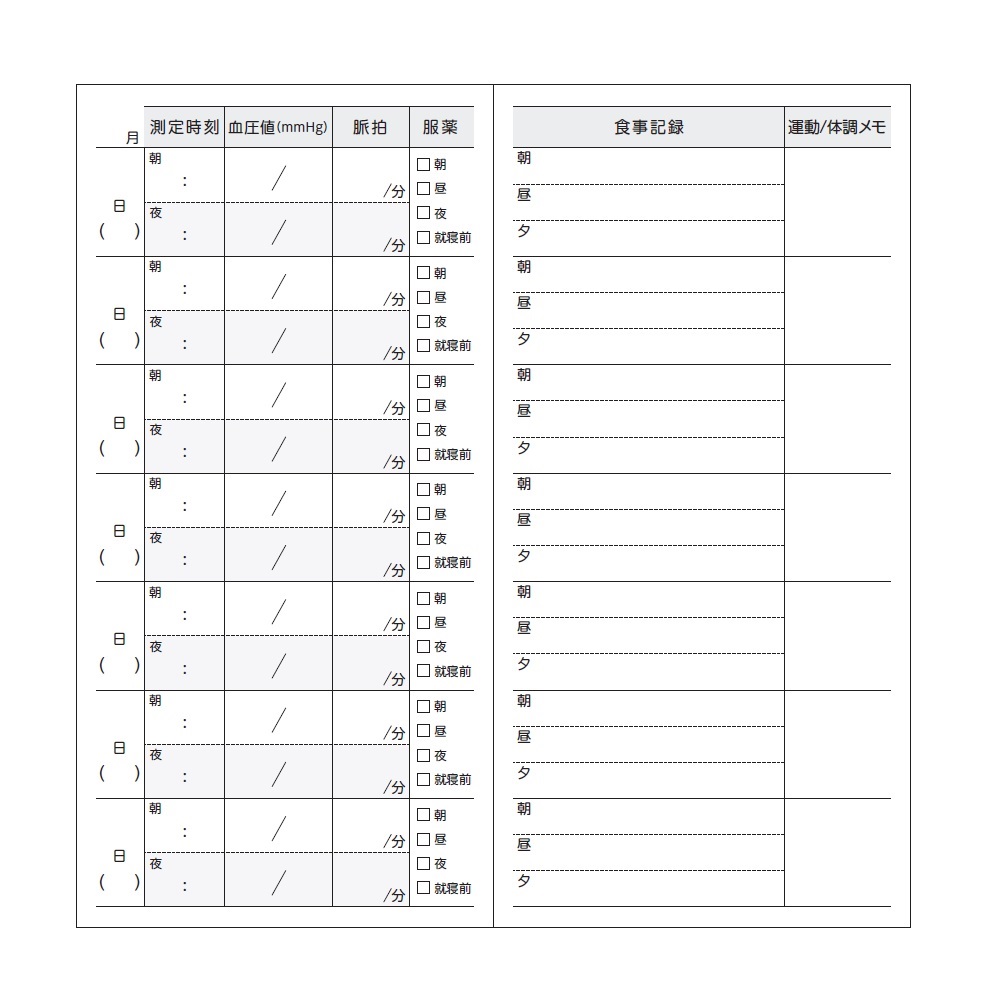毎日、朝と夜の測定時刻、血圧値、脈拍を記入管理できるほか、服薬を行ったかどうかをチェックボックスで記録が可能。