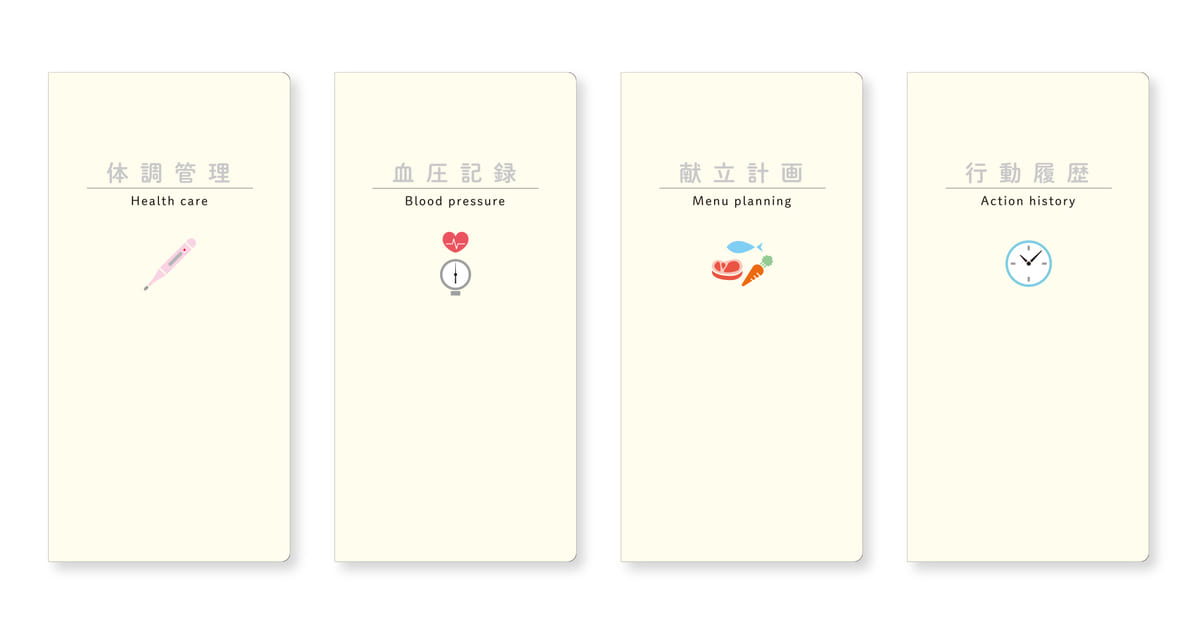 体調管理・血圧記録・献立計画・行動履歴などを把握できる4種のメモです。