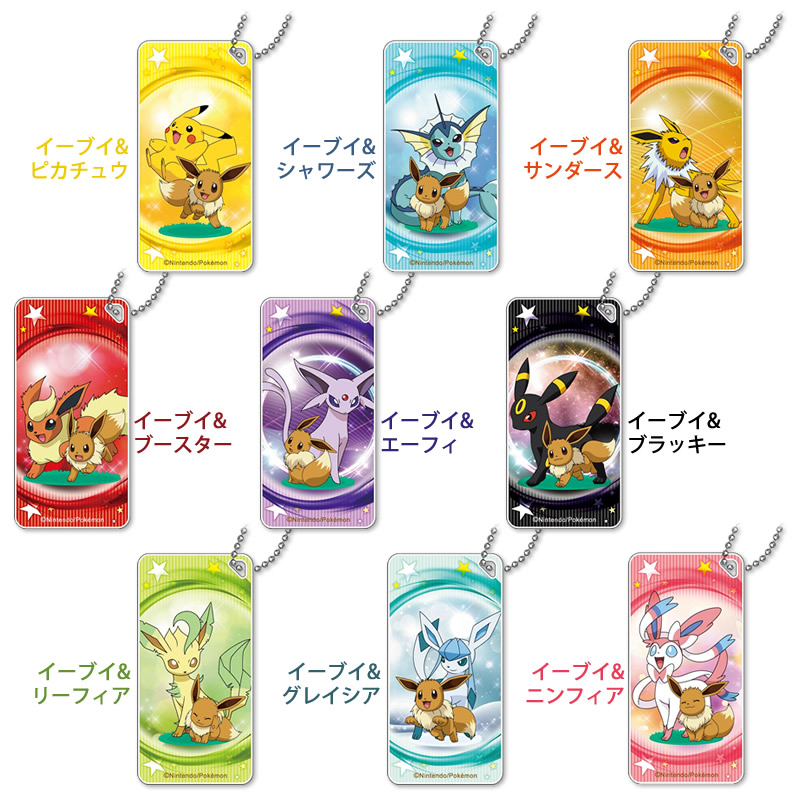 種類は、「イーブイ&ピカチュウ」、それに「イーブイ」と「イーブイ」の進化系「ポケモン」8種類が描かれた全9種類。