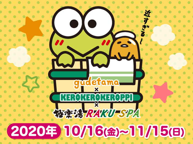 「ぐでたま・けろけろけろっぴ×極楽湯・RAKU SPAコラボキャンペーン」は、極楽湯・RAKU SPA直営21店舗にて、2020年10月16日(金)から11月15日(日)まで開催されます。