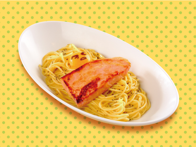 豪快なカルボナーラにも、「ぐでたま」のお顔がポンと乗っています。